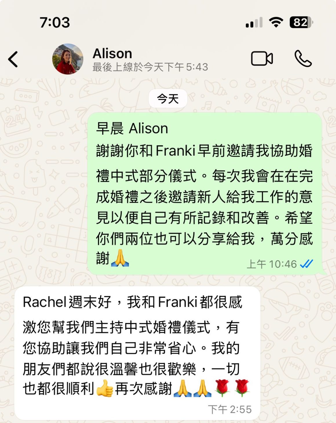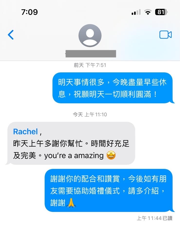 “It’s very rare to find a Chinese Wedding Planner to host the tea ceremony of my son. Rachel the Chinese Wedding Planner is very professional. Before the wedding day, she gave me lots of advices and details about traditional wedding cultures (e.g. presenting and returning wedding gifts 過大禮/送大禮, hosting tea ceremony on the wedding day 斟茶儀式, etc.). I really appreciate Rachel’s professional services.” – Mrs. Lo